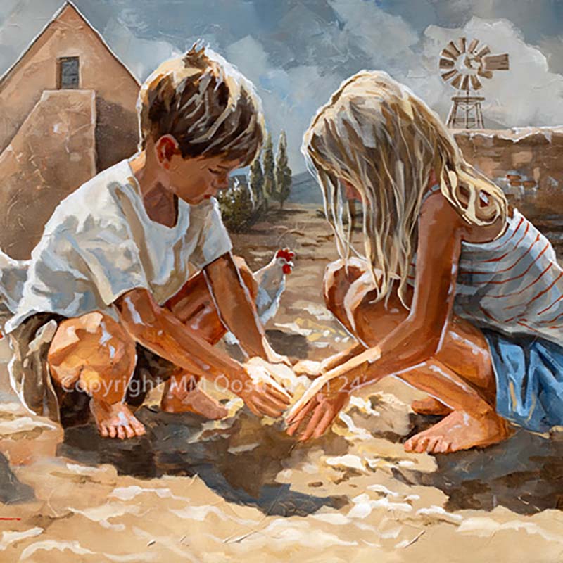 Beautiful figurative artwork of a girl and boy sitting on the dock with their arms around each other.